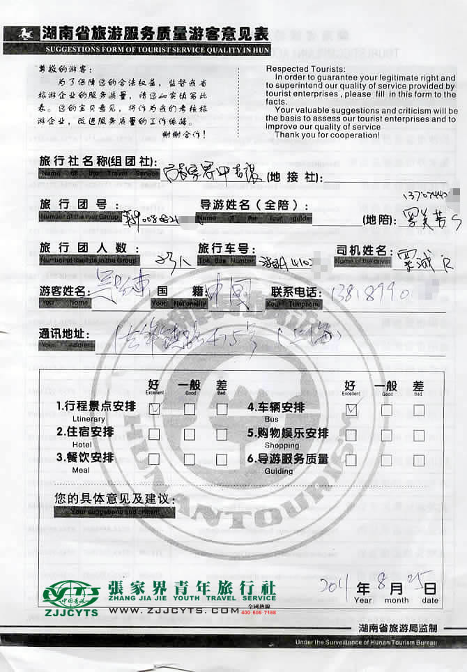 上海長寧區(qū)“吳先生”與張家界青旅旅游顧問——客服“卓東來”在08月14日取得聯(lián)系,并就線路、行程的合理選擇、旅游景點的選定,以及服務(wù)的具體要求、范圍,做了多次在線溝通和電話溝通,經(jīng)過細致的商磋,最終在08月17日雙方簽訂了《國內(nèi)旅游組團接待合同》,并正式確立由我社負責(zé)全程接待安排;吳先生一行23人貴賓于08月22上午乘坐K533次,于次日8月23上午7:00許抵達張家界火車站,我社導(dǎo)游和司機前往迎接站,當日便開始了為期3天行程的走進張家界山水之旅,08月25日下午18點結(jié)束行程,搭乘K1374次返程赴上海。