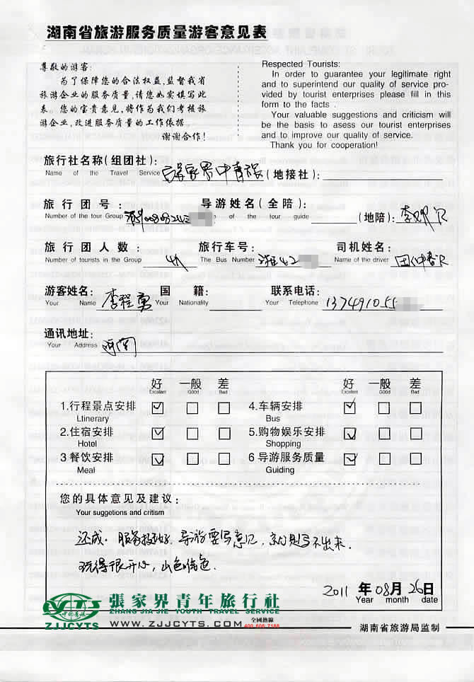河南鄭州市“李先生”與張家界青旅旅游顧問——客服“黃靜”在08月17日取得聯(lián)系,并就線路、行程的合理選擇、旅游景點(diǎn)的選定,以及服務(wù)的具體要求、范圍,做了多次在線溝通和電話溝通,經(jīng)過仔細(xì)的商磋,最終在08月19日雙方簽訂了《國內(nèi)旅游組團(tuán)接待合同》,并正式確立由我社負(fù)責(zé)全程接待安排;李先生一行4人貴賓于08月22上午乘坐1645次,于次日8月23上午7:40許抵達(dá)張家界火車站(晚點(diǎn)20余分鐘),我社導(dǎo)游和司機(jī)前往迎接站,當(dāng)日便開始了為期4天行程的湘西之旅,08月26日中午午餐后返程張家界,于當(dāng)日下午18點(diǎn),搭乘K268次返程。