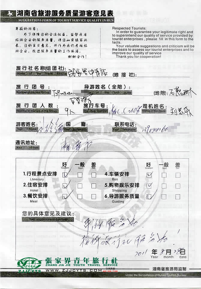 湖南湘潭市“劉先生”與張家界青旅旅游顧問——客服“谷盈”在08月19日取得聯(lián)系,并就線路、行程的合理選擇、旅游景點(diǎn)的選定,以及服務(wù)的具體要求、范圍,做了多次在線溝通和電話溝通,經(jīng)過仔細(xì)的商磋,最終在08月21日雙方簽訂了《國內(nèi)旅游組團(tuán)接待合同》,并正式確立由我社負(fù)責(zé)全程接待安排;劉總一行9人,于08月25上午從湘潭自駕車(3臺(tái)),于當(dāng)日抵達(dá)張家界市,住宿晶悅酒店,晚上觀看天門狐仙演出,次日便開始了為期3天行程的張家界之旅,08月28日中午午餐后自駕返程。