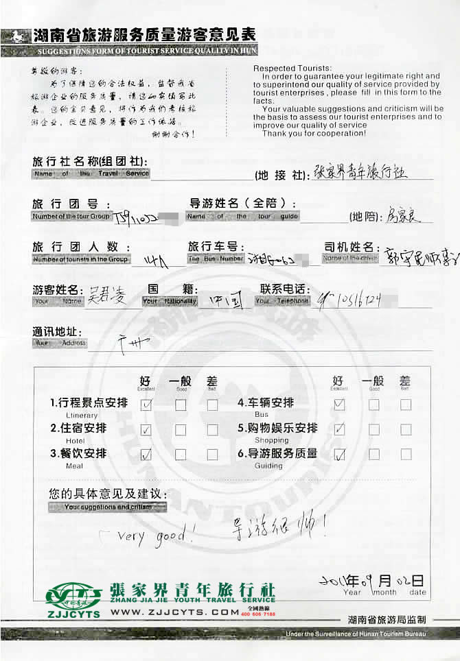 在此向廣州晶爾曼首飾有限公司吳總一行14位貴賓致以衷心的感謝,感謝您給予我們中青旅為您一行服務(wù)的機(jī)會,同時也感謝貴賓一行對我社行程安排及導(dǎo)游服務(wù)給予的高度評價,歡迎各位貴賓再次蒞臨美麗的張家界做客觀光,順祝商祺。--客服經(jīng)理“李超陽”留言。