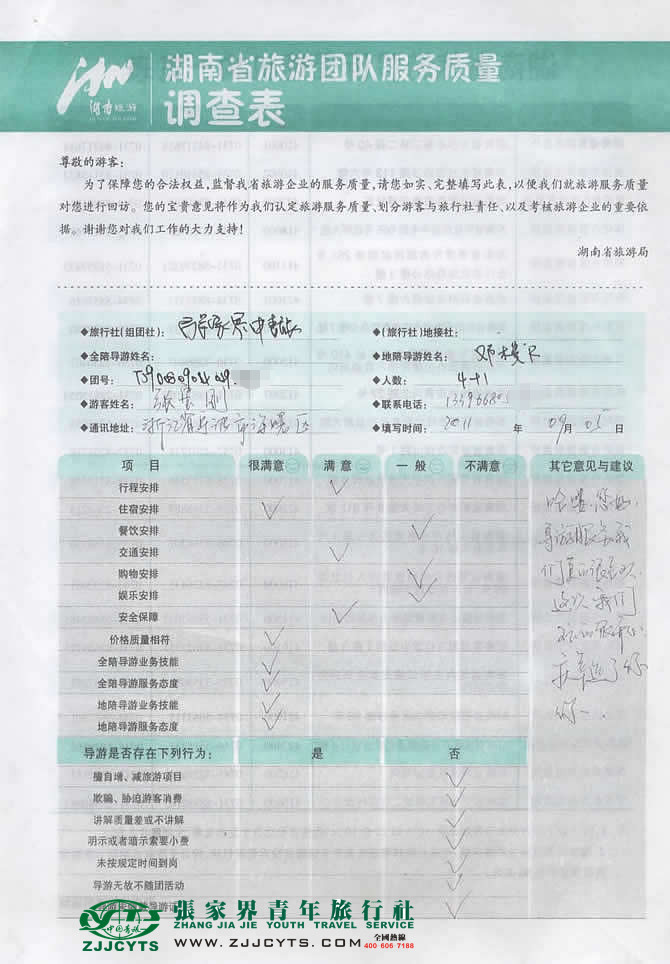 | 在此向?qū)幉ㄕ愀燮囦N售有限公司一行5位貴賓致以衷心的感謝,感謝您給予我們中青旅為您一行服務(wù)的機(jī)會(huì),同時(shí)也感謝貴賓一行對(duì)我社行程安排及導(dǎo)游服務(wù)給予的高度評(píng)價(jià),歡迎各位貴賓再次蒞臨美麗的張家界做客觀光,順祝商祺。--客服“卓東來(lái)”留言。 |
