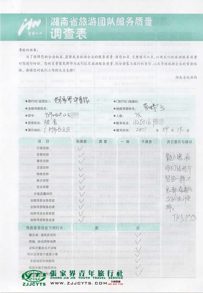 廣東廣州市“駱女士”與張家界青旅旅游顧問——客服:“李娜”在09月07日取得聯(lián)系,并就線路、行程的合理選擇、旅游景點(diǎn)的選定,以及服務(wù)的具體要求、范圍與廣東駱女士,做了多次電話溝通,最終在09月10日雙方簽訂了《國(guó)內(nèi)旅游組團(tuán)接待合同》,并正式確立由我社負(fù)責(zé)全程接待安排;駱女士一行7人,于09月10日搭乘高鐵G1052次抵達(dá)長(zhǎng)沙,貴賓一行在長(zhǎng)沙做了一晚的停留,住宿在莫泰168連鎖酒店;次日自長(zhǎng)沙出發(fā)參加我社散拼成團(tuán)赴張家界,開始了為期4天行程的湘西之旅,該行程于09月14日晚上21:40許在長(zhǎng)沙結(jié)束,貴賓在長(zhǎng)沙停留一晚,次日后返程